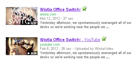 A YouTube copy of a video will also compete directly with a self-hosted or pro-hosted version in video search results (in Google, Bing, etc). If you are hoping to drive additional traffic to your website via video results, a YouTube version of a video that appears above the one on your site is not ideal. Building your own video sitemap (which is possible using Wistia’s tools) helps your website version appear in the results, but getting it to outrank a YouTube version is never a guarantee.