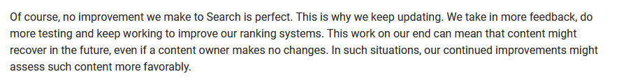 “Content that was impacted by one might not recover—assuming improvements have been made—until the next broad core update is released.”
