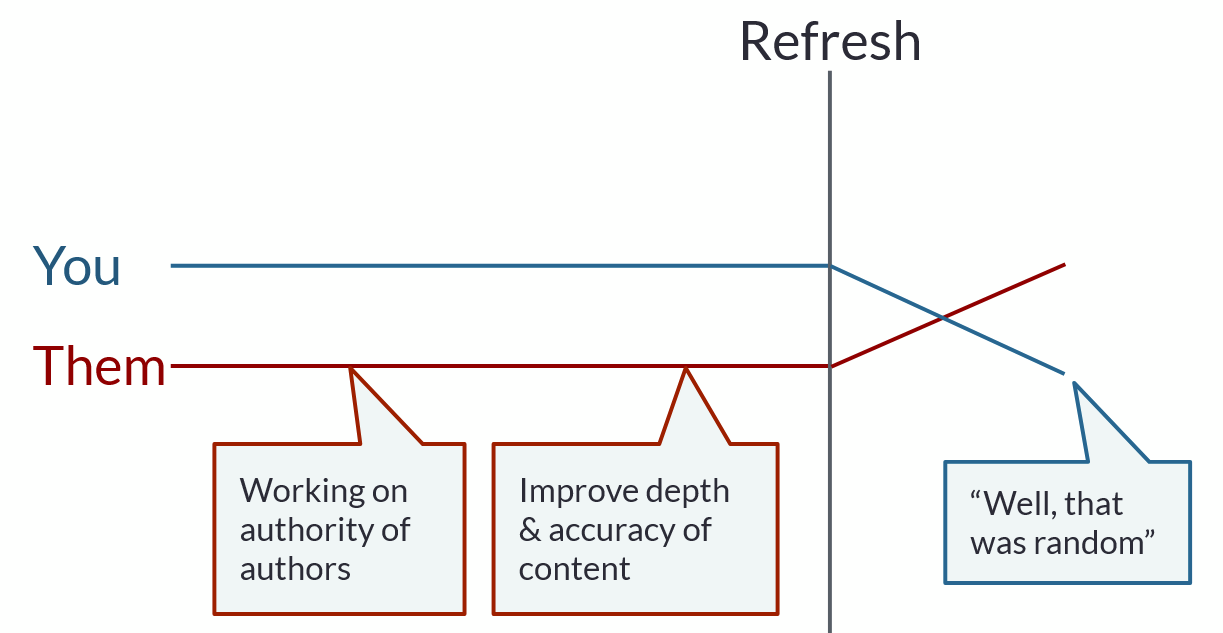 If your search competitor makes a bunch of improvements to their site, then when a Core Update comes round, under this model, you will suddenly drop. This is no indictment of your own site, it’s just that SEO is often a zero sum game, and suddenly a bunch of improvements to other sites are being recognized at once. And if they go up, someone must come down.