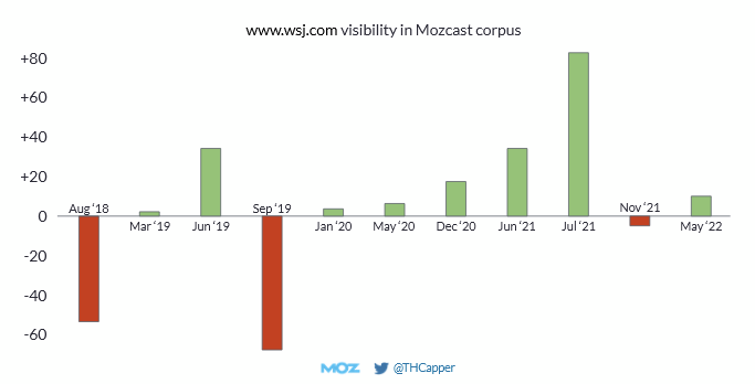 I should caveat: this is in the MozCast corpus only, not the general performance of Reuters. But still, these are real rankings, and each bar represents a Core Update where they have gone up or down. (Mostly, down.) They are not the only ones enjoying a bumpy ride, either.