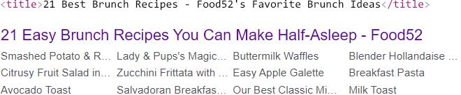 This is a case where Google replaced the <title> with the contents of an <h1> — while it’s not a bad rewrite, it does feel aggressive to me. It’s hard to see how “21 Best Brunch Recipes” is wildly over the top or how “21 Easy Brunch Recipes” is a major improvement.