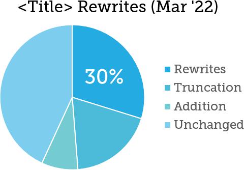 Separating truncations and additions, we’re left with about 30% of <title> tags being rewritten in our data set. Keep in mind that many of these rewrites are minor and some probably involve forms of truncation and/or addition that were difficult to detect programmatically.