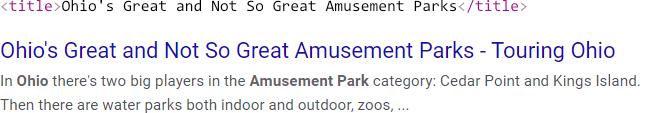 I kind of love this title, and you should definitely ride Top Thrill Dragster at Cedar Point if you’re a coaster fan, but notice here how Google has appended “Touring Ohio” to the end of the display title. This kind of add-on is very common, occurring in almost 14% of our observed rewrites.