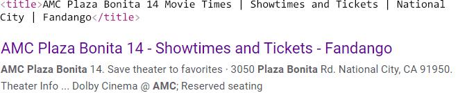 AMC hasn’t really done anything spammy here — this <title> tag is likely a direct reflection of their site architecture. In this case, though, Google has gone beyond truncation and rewritten the title, including replacing pipes with hyphens, removing “Movie Times” (which is arguably redundant with “Showtimes”) and pushing the site/brand up.