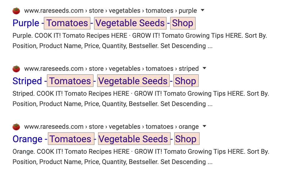 In this example below, the boilerplate text on every title includes "Tomatoes - Vegetable Seeds - Shop."