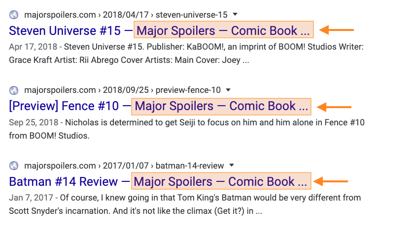Sometimes boilerplate material can become quite long. The comic book review site Major Spoilers (awesome name!) often includes the same 65-character boilerplate on many pages: