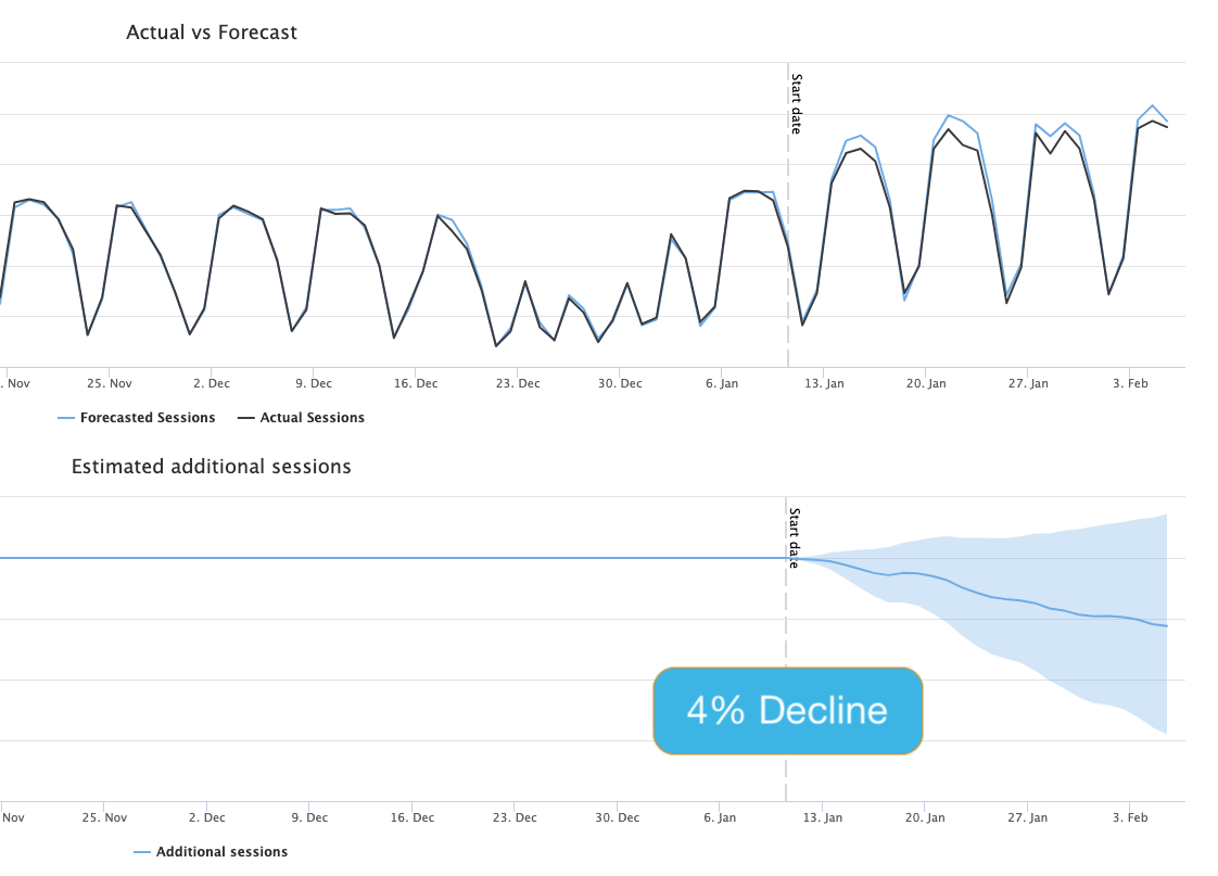 This chart represents the cumulative impact of the test on organic traffic. The central blue line is the best estimate of how the variant pages, with the change applied, performed compared to how we would have expected without any changes applied. The blue shaded region represents our 95% confidence interval: there is a 95% probability that the actual outcome is somewhere in this region. If this region is wholly above or below the horizontal axis, that represents a statistically significant test.
