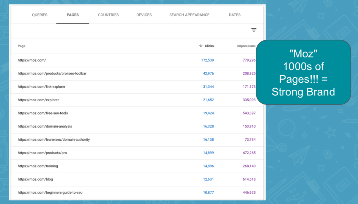 As our brand name is part of so many queries and leads to visits across thousands of pages, this tells us that "Moz" is a very strong brand, and we'd likely be smart to include it as part of our title tags.