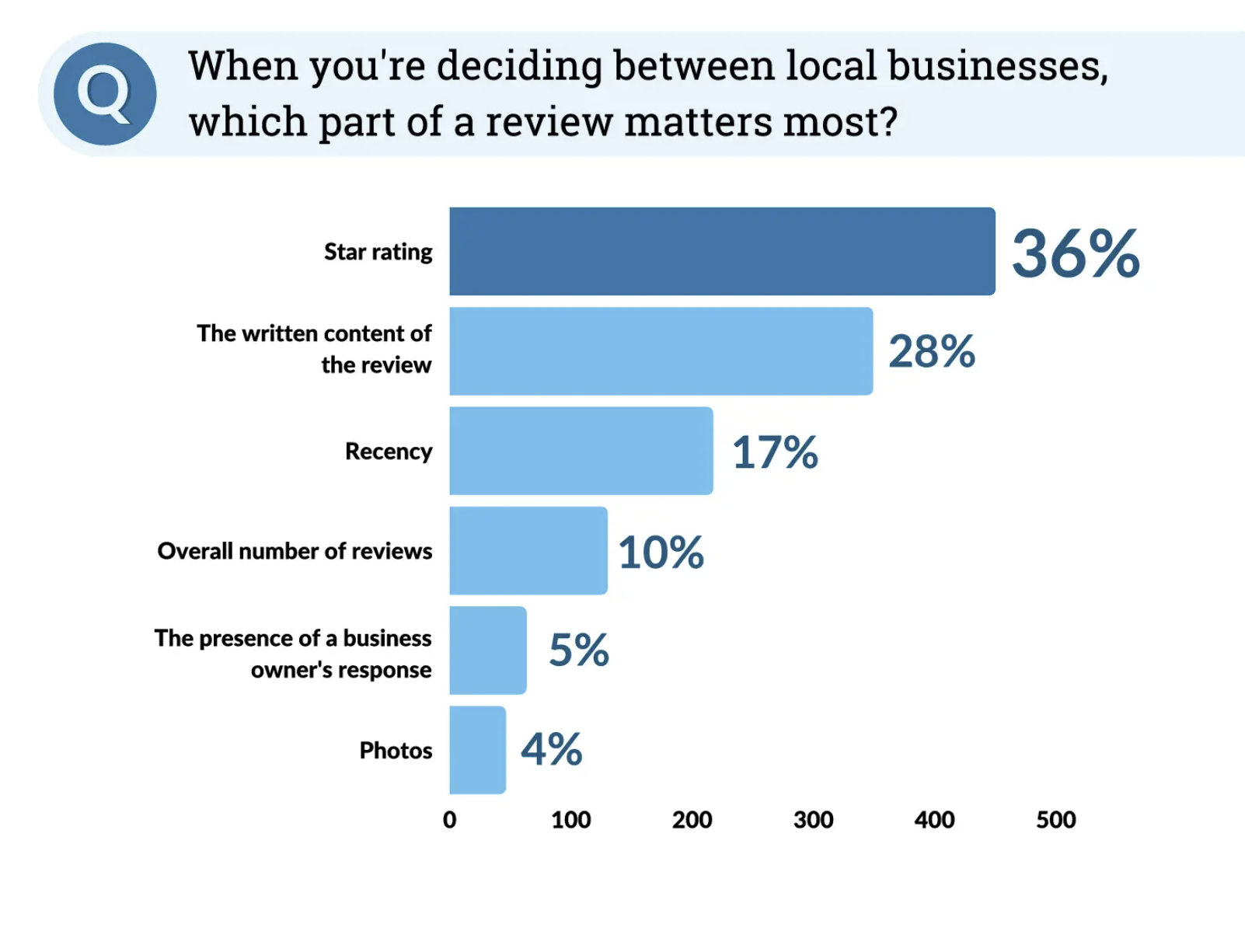 Your average star rating isn’t just a top local pack ranking factor, but it’s also a top conversion factor. In our report on the Impact of Local Business Reviews on Consumer Behavior, respondents cited the star rating as the most important component of reviews: