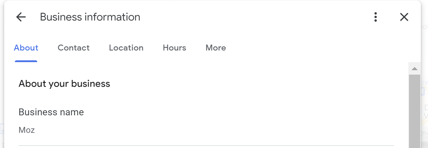 The field is meant to contain only your real-world business name as it appears on your street signage with no extraneous keywords. In this screenshot, you can see that the name is just listed as “Moz”. Not “Moz Vancouver” or “Moz Seattle” or “Moz best SEO software company in America”.