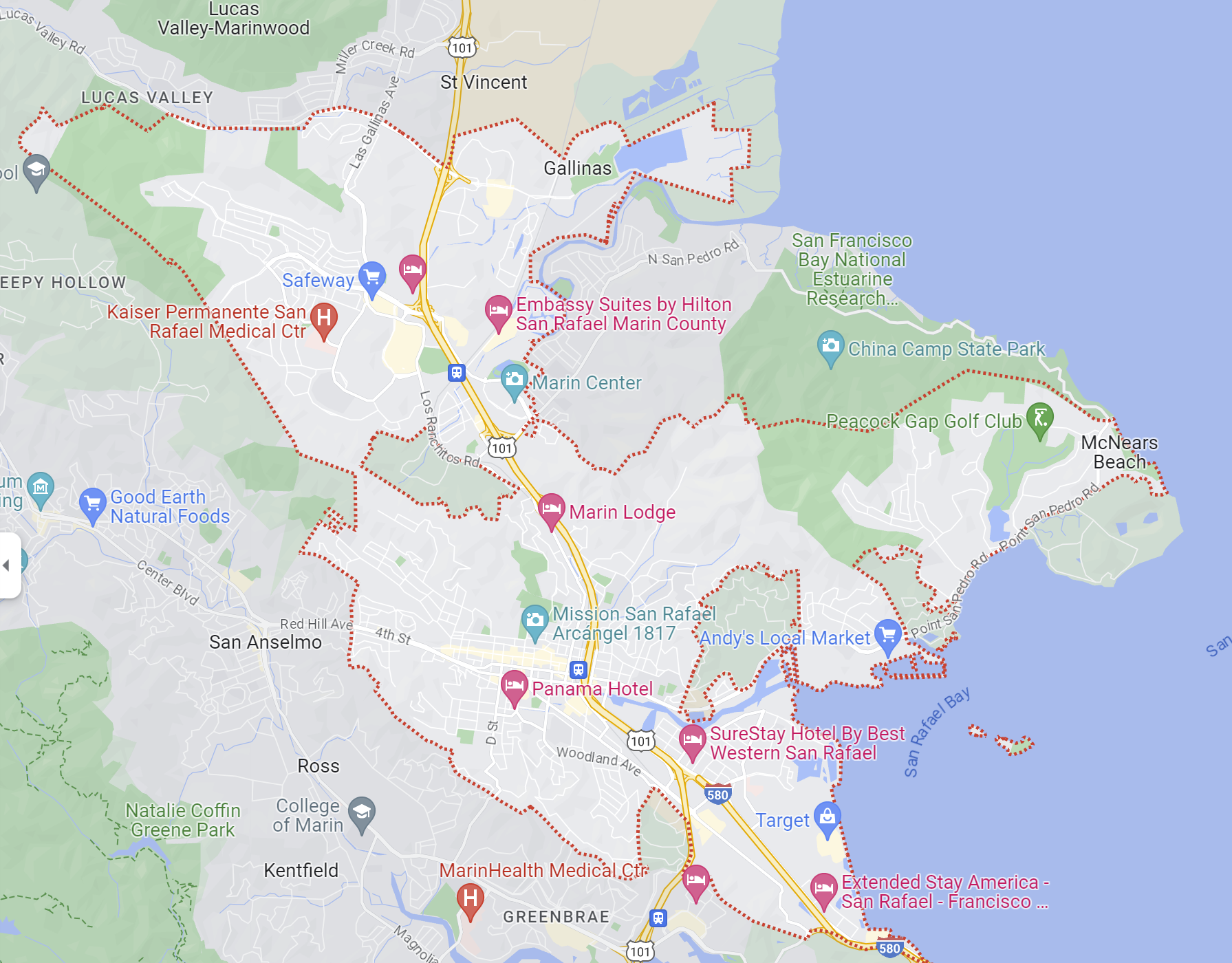 Look up your city in Google and click on the map. The red border, as shown above, indicates Google’s concept of the perimeters of your town or city. The reason this matters to local SEO is that businesses located beyond the border often have a much harder time becoming visible for searchers located within the border or for search phrases that contain the name of the town or city.