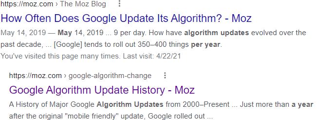 Google has determined that both pages are relevant to this search (for “how many algorithm updates per year”), but that the specific blog post is more relevant. Indented results are of particular interest to SEOs because not only can you double-dip, but the indented listing(s) can, in some cases, get pulled from lower positions and effectively get a ranking boost.