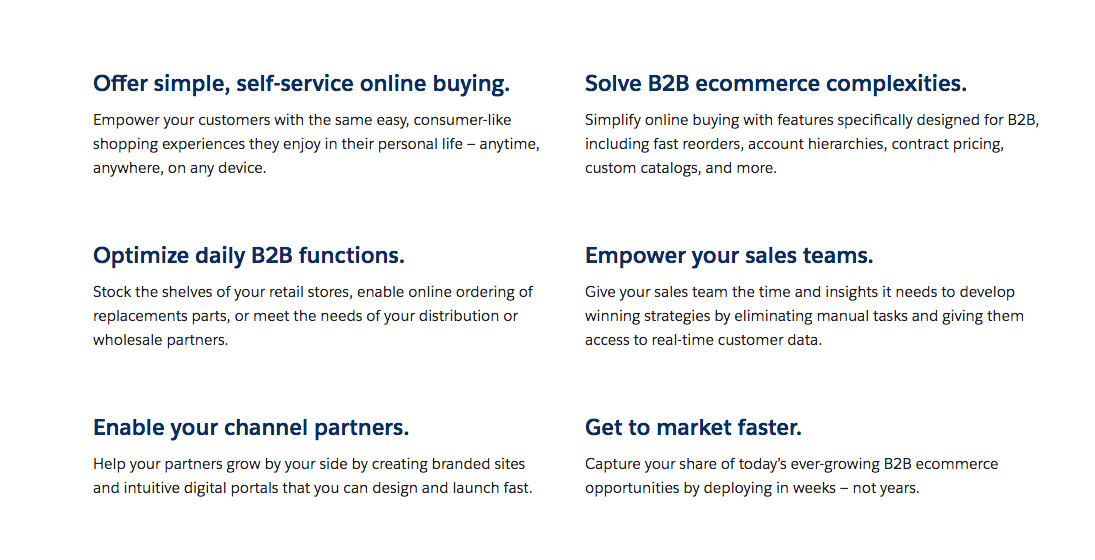 For example, look below at how descriptive Salesforce is about its B2B e-commerce solution. I’ve included a snippet here of a very long web page covering nearly 20 different benefits of using Salesforce for your online marketplace.