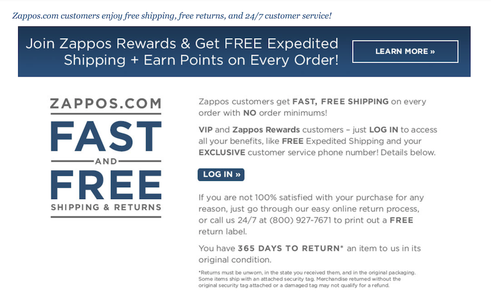 Zappo’s rewards program does a great job of getting people to sign up for free shipping and returns and exclusive access to 24/7 customer service.