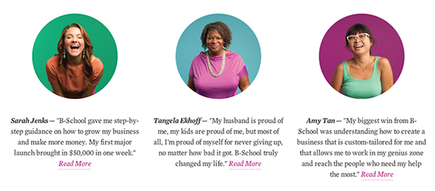 Notice how each testimonial explains exactly how B-school helped them succeed. Sarah’s testimonial is especially notable because she has some solid numbers in her quote: $50,000 in one week is a great result and could prompt new customers to work with B-School as well!
