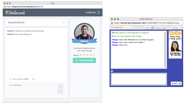 Look at how SiteGround proves you are talking to a real expert that can help you based on an actual photo, name, ratings and how many customers have been served. On another note, who is that lady on the right? I’m pretty sure her name isn’t Diego like it shows. When using live chat, make it clear to your visitors that they are actually talking to a live person.