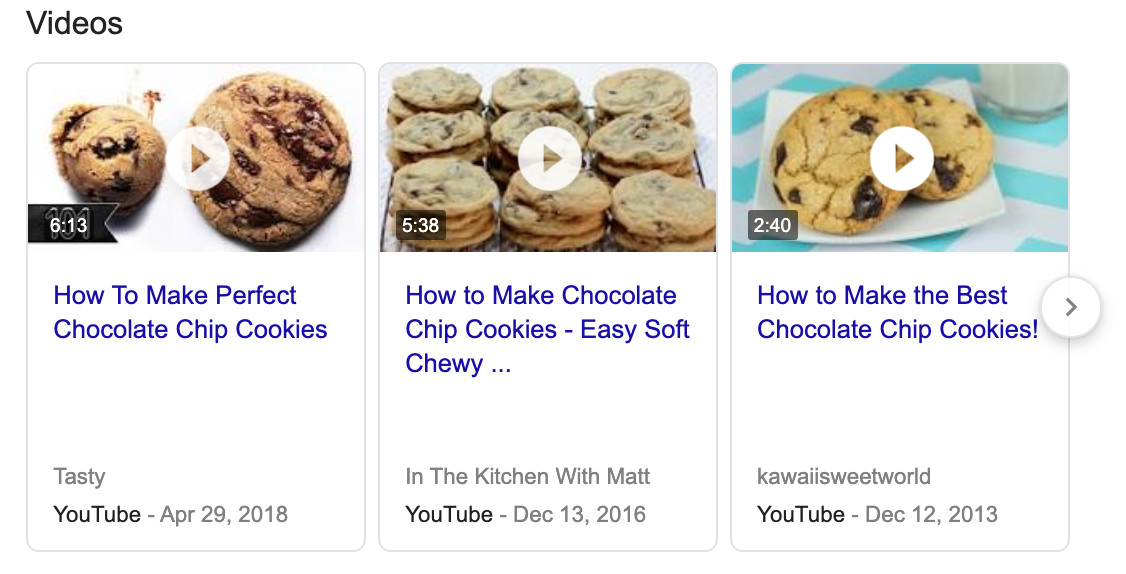 But even further than that, we are seeing more and more social media platforms such as Pinterest, YouTube, and Twitter showing up as search results and snippets. For example, below is the SERP for the keyword “how to make cookies”, where a series of YouTube videos show up: