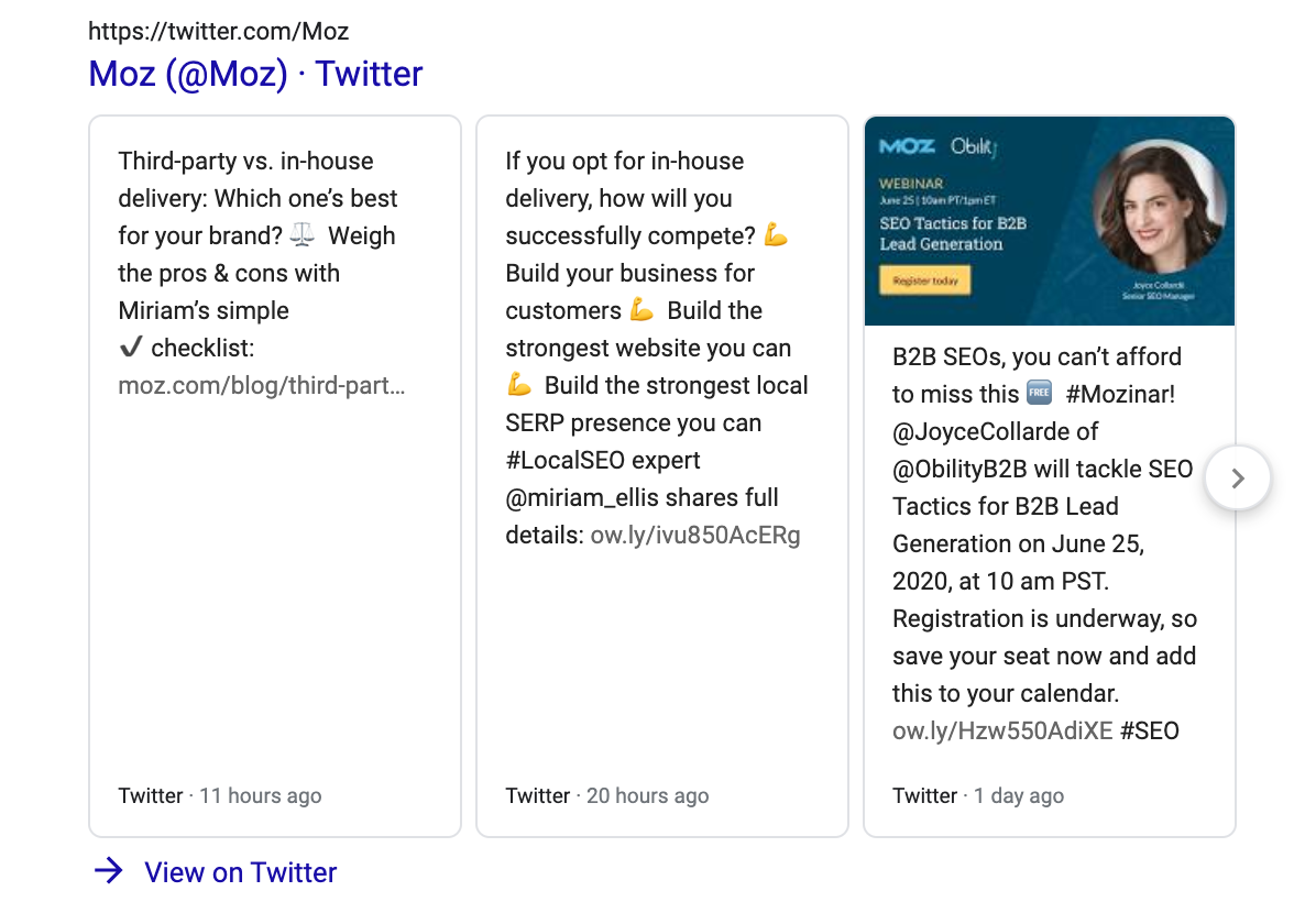 And this SERP for the keyword “Moz“ has the most recent Tweets from Moz's Twitter.