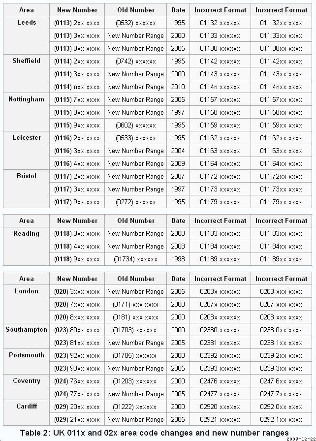 - Look for numbers that should be formatted as (011x) xxx xxxx, but which are quoted using their old pre-PhONEday area code; e.g. (0602) 557788 should be (0115) 955 7788. Likewise (0734) 334455 (and 01734 334455 for that matter) should be (0118) 933 4455.