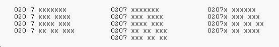 - Fix (02x) xxxx xxxx numbers to be in the correct format; e.g. 0207 555 7777 or 02075 557777 should be (020) 7555 7777. If the original number appears to be a digit short, then it's probably a pre-PhONEday number that instead needs a '1' adding immediately after the 0 trunk code; e.g. (0207) 444555 should probably be (01207) 444555.