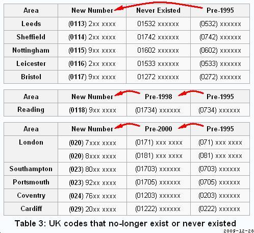 Not only is there the problem of people misquoting the current area codes listed in table 2, there is also a problem where people are quoting area codes that have never existed. During PhONEday in 1995, most UK geographic area codes were changed by adding a '1' immediately after the initial '0' trunk code of the existing area code, except for five places that gained a completely new 011x code and had an extra digit added to the local number part. Unfortunately, there are a large number of people who converted all UK numbers by adding a 1 to the existing area code, and ignored those special instructions for Leeds, Sheffield, Nottingham, Leicester and Bristol area codes. The resulting codes, codes that have never existed, are listed in the first part of table 3. There are tens of thousands of websites listing numbers supposedly using these non-existent area codes.