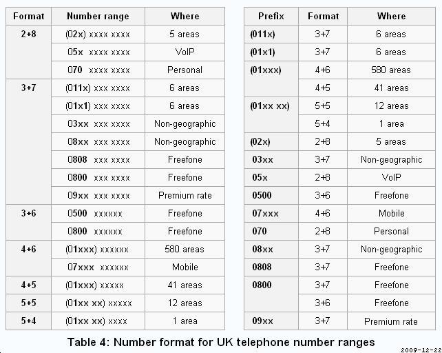 UK numbers now mainly have ten digits after the zero trunk code, although a few have only nine digits. This is a quick summary of the correct format to use with each of the UK number ranges. Several other sites list the area codes in detail.