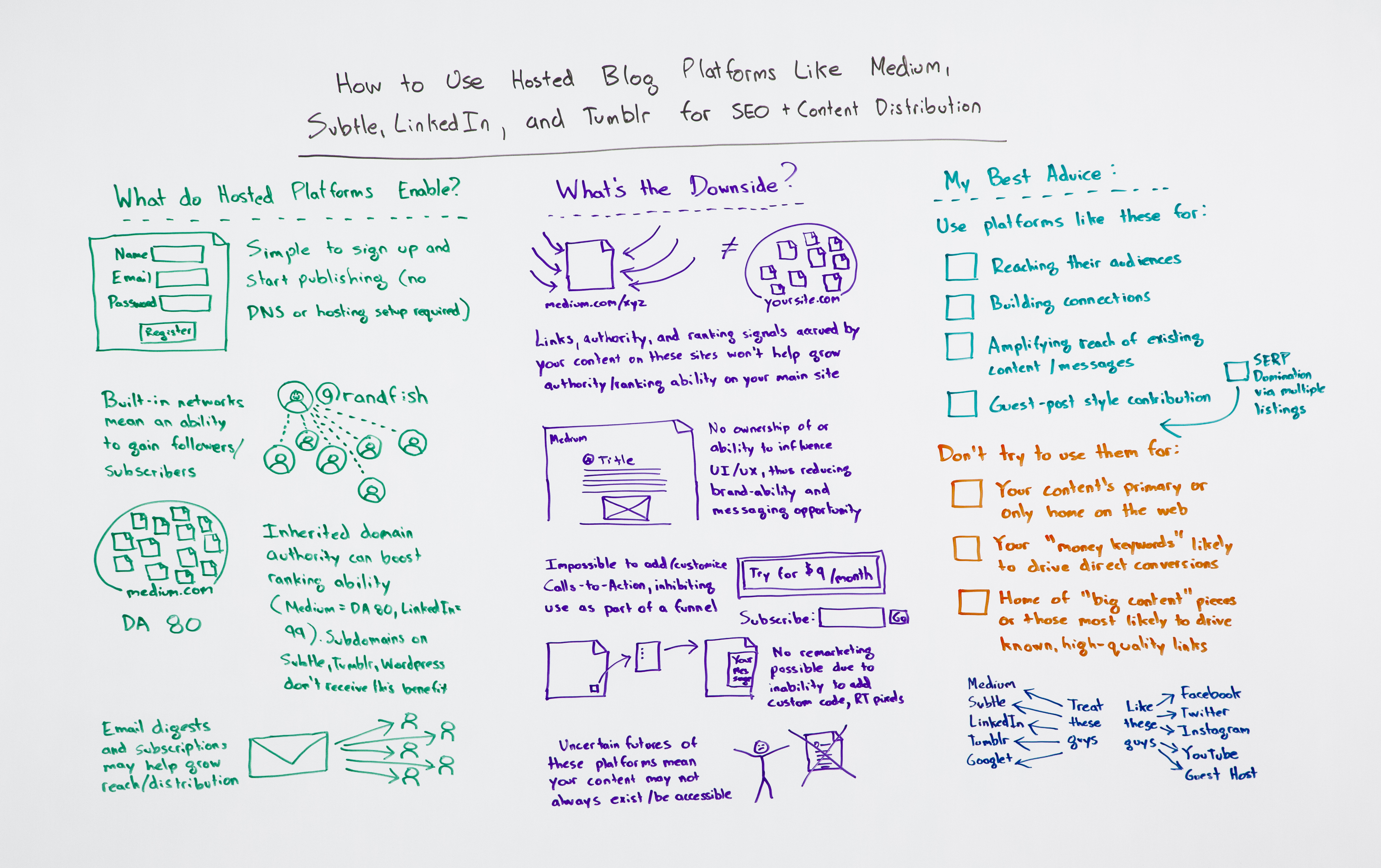 So my best advice here is, use platforms like these for reaching their audiences. I think it can be great to say, "Hey, 1 out of every 10 or 20 posts I want to put something up on Medium, or I want to test it on Google+, or I want to test it on LinkedIn because I think that those audiences have a lot of affinity with what I'm doing. I want to be able to reach out to them. I want to see how those perform. Maybe I want to contribute there once a month or once a quarter." Great. Wonderful. That can be a fine way to draw distribution there.