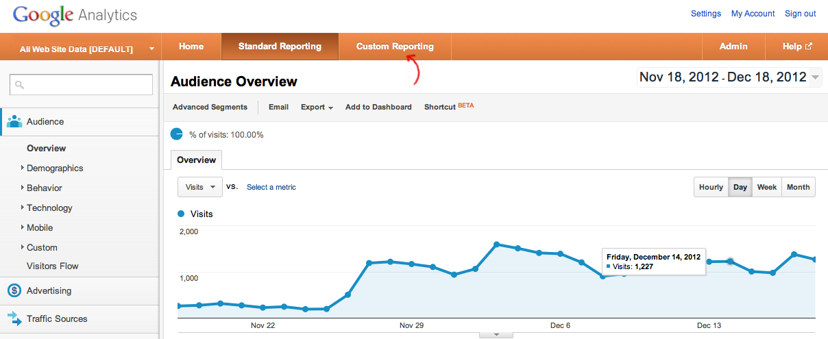 Custom reports are an awesome way to tell Google Analytics which dimensions and metrics we want to analyze. Once logged into Google Analytics, go to the “custom reporting” tab, then click in the “+New Custom Report” button