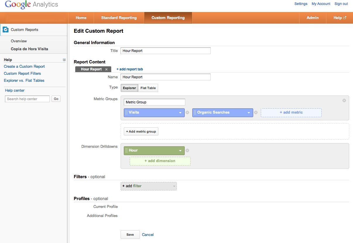 Finally, you can save the report and wait for Google Analytics to apply the report to your data. After saving the report, you will be able to see your visits segmented according to the hour in which they occurred.