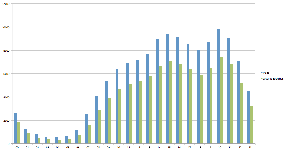 Now, the overall number of visits can be influenced by many different factors, for example, if you tweet something using a link pointing to your site at a specific time, then probably you are influencing directly the number of visits sent to your website. That’s why I like to include and analyze the “organic searches” dimension, as this in theory would represent a more “natural” hourly trend in which users are finding your site.
