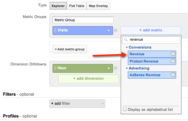 Another usage for your report is to map your conversions and revenue based on the hour they occur. Just select those metrics while creating the report: