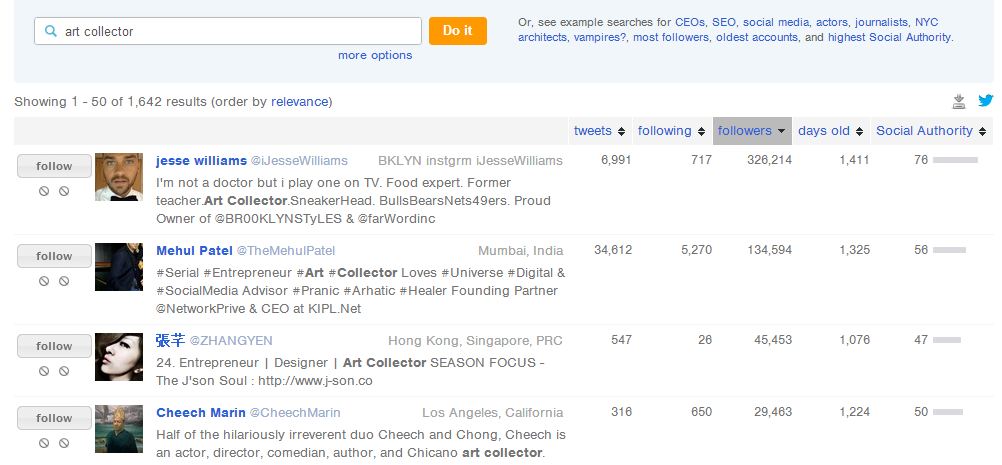 Because there can, at times, be so many people on Followerwonk to choose from, as I discovered just within the search term “art collector”, you can start with just a handful of people ranging from those with a high number of followers to those with a low number of followers. Your display will let you sort results based on Tweets, Following, Followers, Days Old, and Social Authority. Keep a nice mix within your list; following those with fewer followers could result in those people as a more likely prospect in following you back.