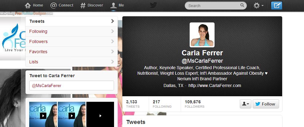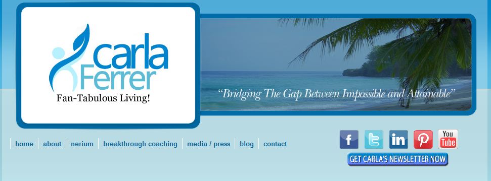 When I go to Carla Ferrer’s website I see her social media icons in the right upper-hand corner of her page – bingo. Now I know how to find her on Facebook, Pinterest and Youtube. (evil laugh here)