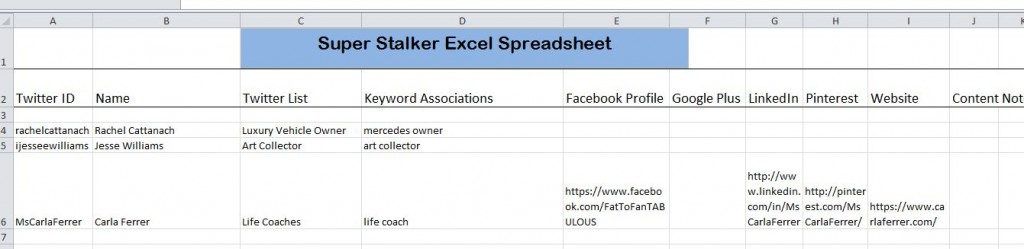 I will now visit each of Carla’s social media pages and either ‘Like’ her, ‘Follow’ her, add her to my Circles and so on. I will also add information about each of her pages and her website address to my Super Stalker Excel Spreadsheet.