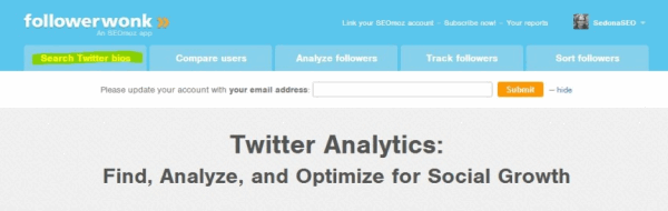 Now, starting with your keyword list let’s start finding people. The process is actually quite simple. The first part of your Twitter search will begin with the use of SEOmoz.org’s tool Followerwonk. Within Followerwonk.com you are going to Search Twitter Bios, which is a tab at the top left portion of the page. When you click on this tab you will be taken to a search box.