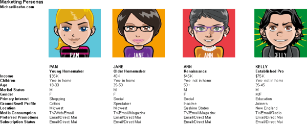 Many people have written about building personas. The most common advice is to name attributes of each persona to include: age, sex, ethnicity, occupation, lifestyle, goals and hobbies. There are a number of defining attributes that you can pick in building your personas. Ian Lurie wrote about Personas in 2007 and his information is still apt - http://www.portent.com/blog/internet-marketing/get_in_your_customers_heads_cr.htm