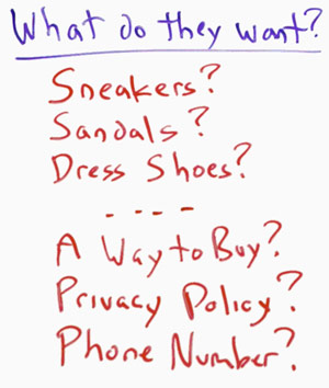 What is that they want when they come to your website? Do they want sneakers, sandals, dress shoes? Well, those are sort of the obvious things that they might want. But you need to think a little bit more about what the user really wants to be able to know before they buy from you.