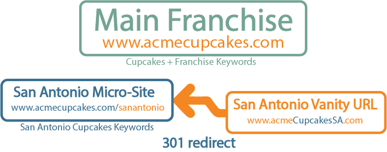 This is an issue I see quite a lot, and it winds up seriously hurting the franchise's SEO opportunities because the franchisee is not able to share in the authority and ranking potential of the franchiser. Thus the new franchisee has to start at zero and work their way up the rankings. By utilizing a vanity URL, I can point my ACMECupcakesSA.com URL to ACMECupcakes.com/SanAntonio and still have a nice short URL to place on my business cards