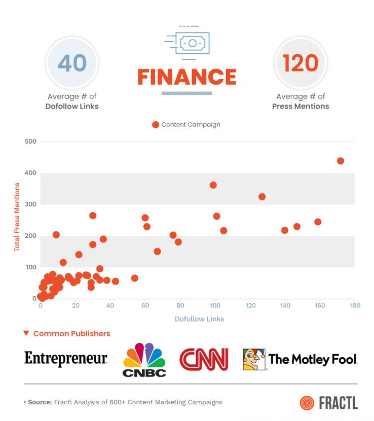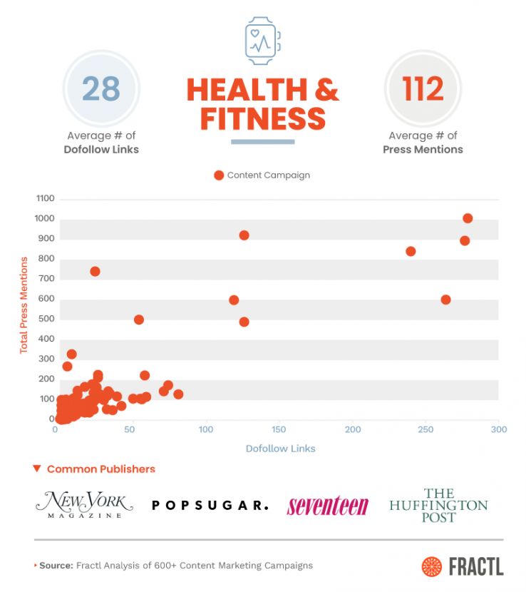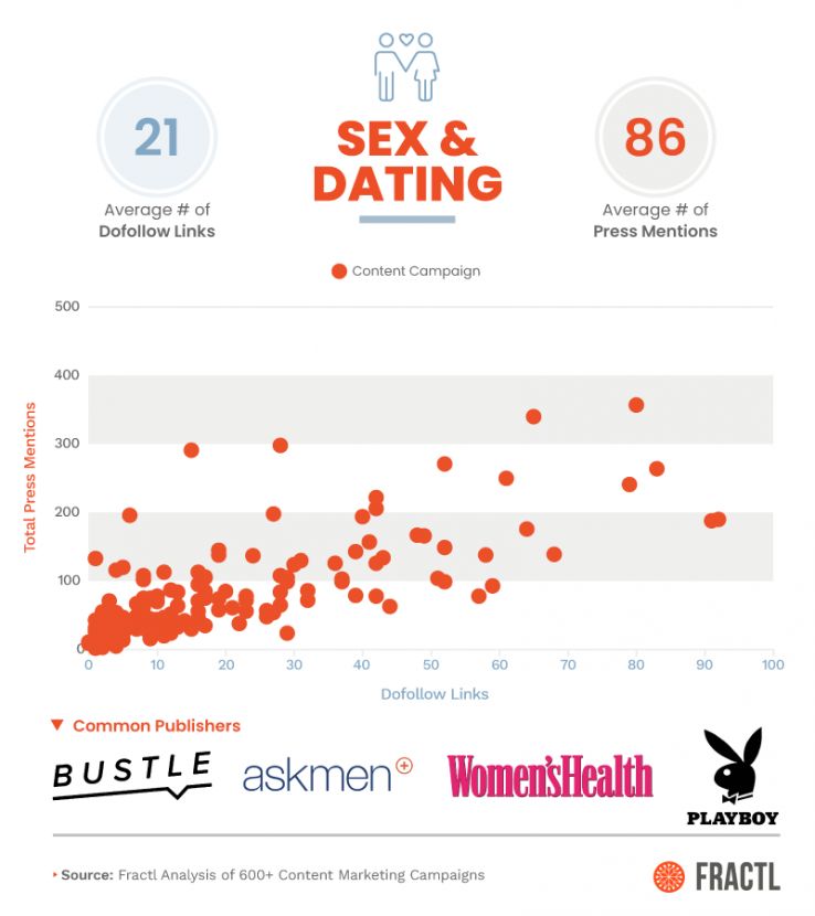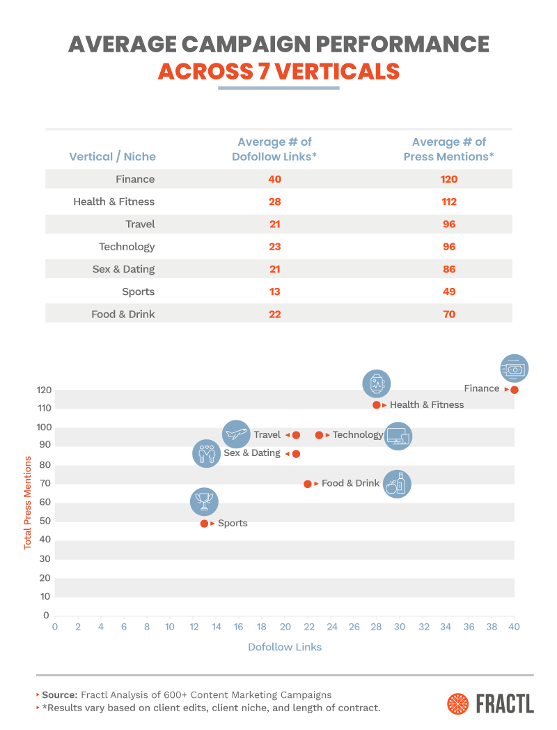 Across the entire sample of 626 content projects, on average, a project received 23 dofollow links and 88 press mentions in total. Some individual vertical averages didn’t deviate much from these averages, while others niches did.