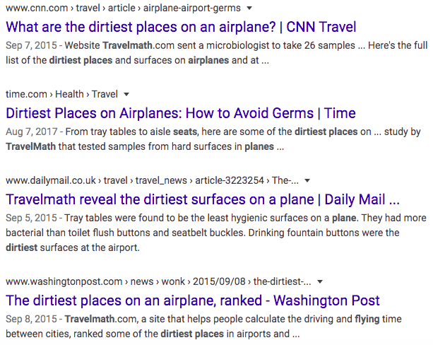 Why did this idea work? Most people travel via plane at least once a year, and everyone wants to avoid getting sick while traveling. So, a data-backed report like this one that also yielded some click-worthy headlines is sure to exceed your outreach goals.