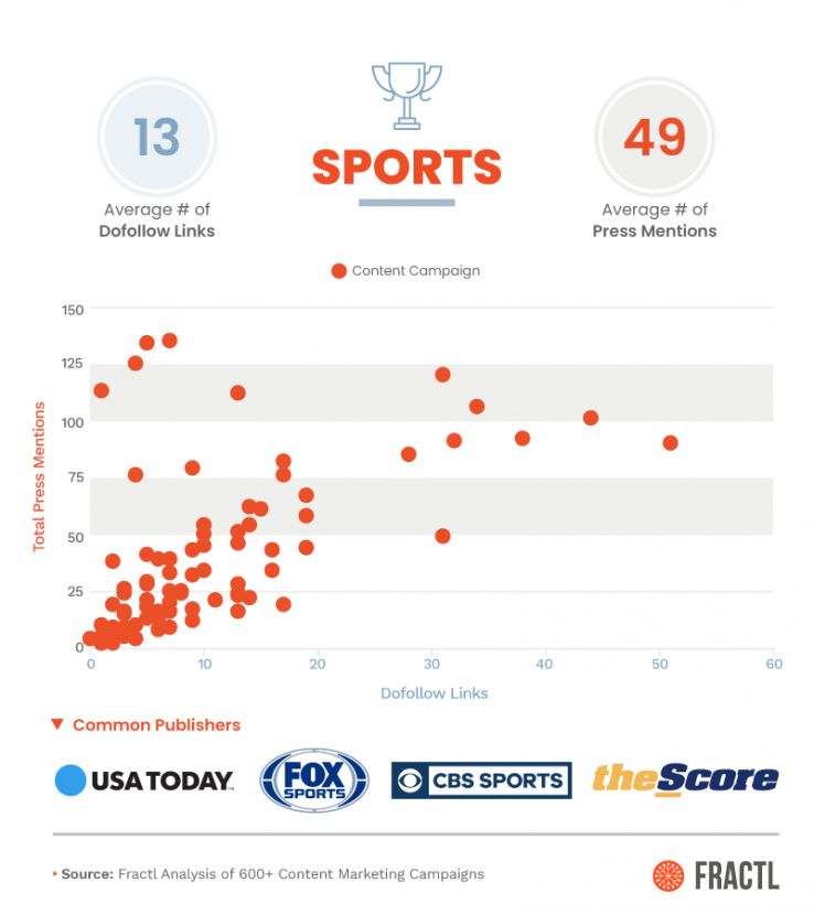 You may have noticed from the analysis above that, of the seven topics we chose to look at, the sports vertical has the lowest average dofollows and total press mentions of any other category.