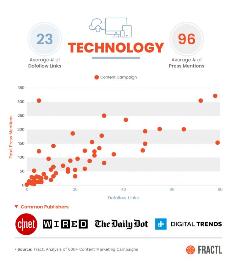 A “press mention” refers to any time a publisher wrote about the campaign. A press mention could involve any type of link (dofollow, nofollow, simple text attribution, etc.). We also looked at dofollow links individually, as they provide more value than a nofollow link or text attribution. For campaigns that went “viral” and performed well above the norm, we excluded them in the calculation so as not to skew the averages higher.
