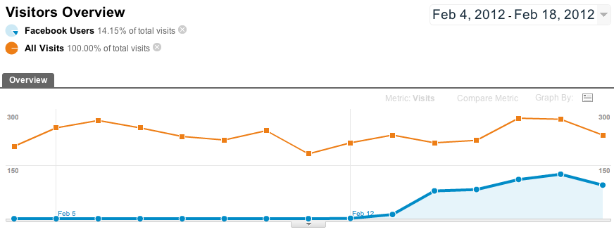 Select those you are interested in and "All Visits" if you also wish to compare against all the traffic, and hit Apply. You can now go into any of your regular report screens and see these 2 demographics against one another; here you can see Facebook visitors to one of my test sites starting to be tracked after I installed the tracking code on Feb 13th: