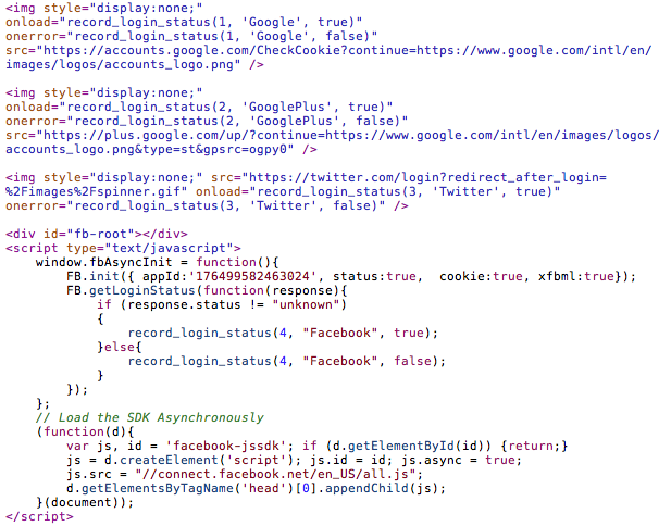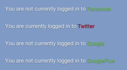 However, whilst Facebook provides an API to allow this kind of intelligence gathering, there is no such API for Twitter and Google+, and a bit of research failed to turn up any techniques that worked across all the browsers. So I rolled up my sleeves and did some digging around, eventually finding a way to trick the login mechanism of these sites to reveal whether a visitor to my site was currently logged in. If you want to try it out visit my Social Network Login Status Detector Demo; it should return something like: