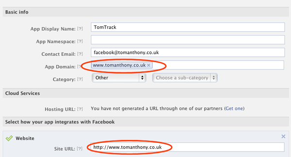 - For "App Display Name" enter anything you want; I used "TomTrack". Check the box to agree to the FB Policies and on to the next page.