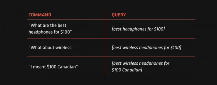 For example, when we asked our Google Assistant, “What are the best headphones for $100,” it queried [best headphones for $100]. We followed that by asking, “What about wireless,” and it searched [best wireless headphones for $100]. And then we remembered that we’re in Canada, so we followed that with, “I meant $100 Canadian,” and it performed a search for [best wireless headphones for $100 Canadian].