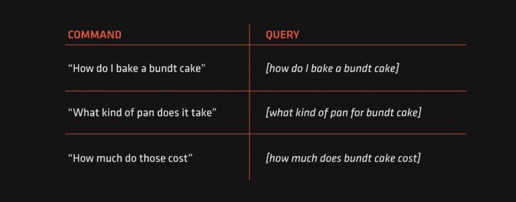 Of course, we’re not above pointing out the fumbles. In the string of: “How to bake a Bundt cake,” “What kind of pan does it take,” and then “How much do those cost,” the actual query Google Assistant searched for the last question was [how much does bundt cake cost].