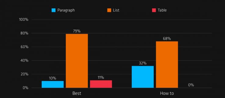 From this, we may be inclined to format all of our “best” and “how to” keyword content into lists. But, as you can see in the chart above, paragraphs and tables are still appearing here, and we could be leaving snippets on the table by ignoring them. If we have time, we’ll dig into which keywords those formats are a better fit for and why.