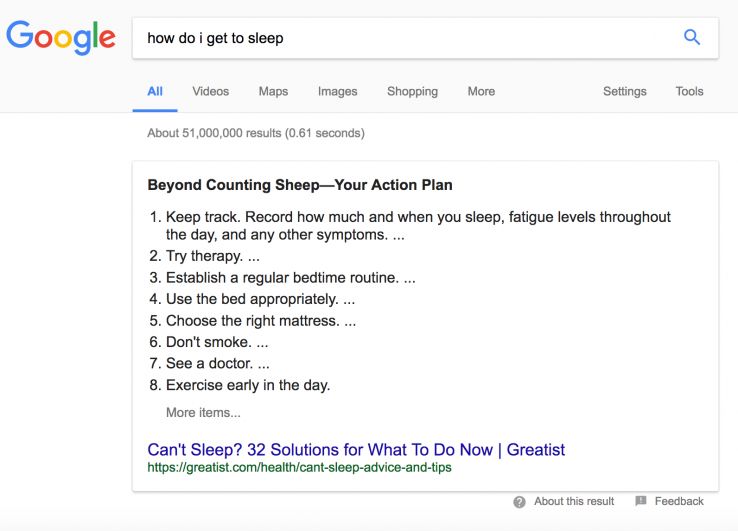 For those that don’t know what a "snippet" is, there’s an example below, shown for a search for "how do I get to sleep":
