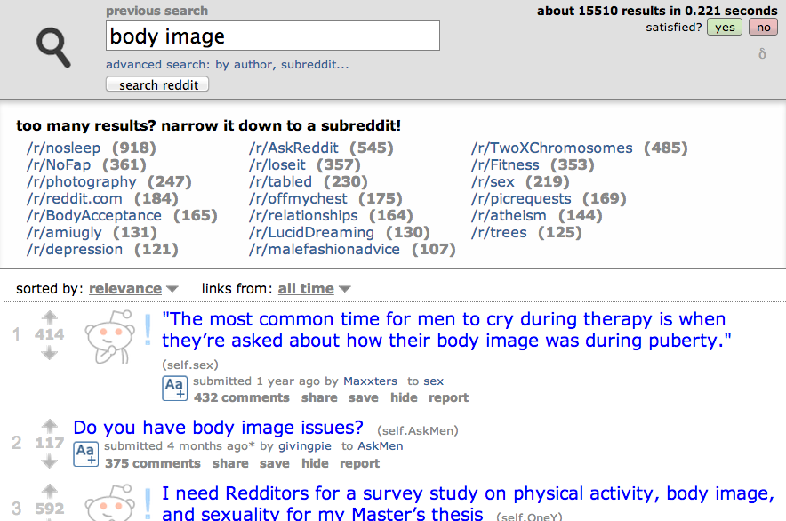 - Reddit: Try doing a simple search for about 3 to 5 keywords related to your topical area. In this case I would try eating disorders, body image, bulimia, and anorexia. For each keyword, I would organize the Reddit results by "top" and set the date range to "all-time," giving me a curated list of content that's ranked from most engaging to least. I then look through each list and pull out the stories that seem like they might be at least marginally interesting. Additionally, when I do these searches, I take note of the subreddits that pop up, often you will find niche communities related to your topic, go to each of these subreddits, and organize by top-all-time, to find the stories that have been most popular within these sub-niches as well. For example, searching "body image" on reddit showed me a subreddit called r/bodyacceptance, which I never knew existed, but seems quite active. Many of their top stories are a great place to start for viral content ideas.